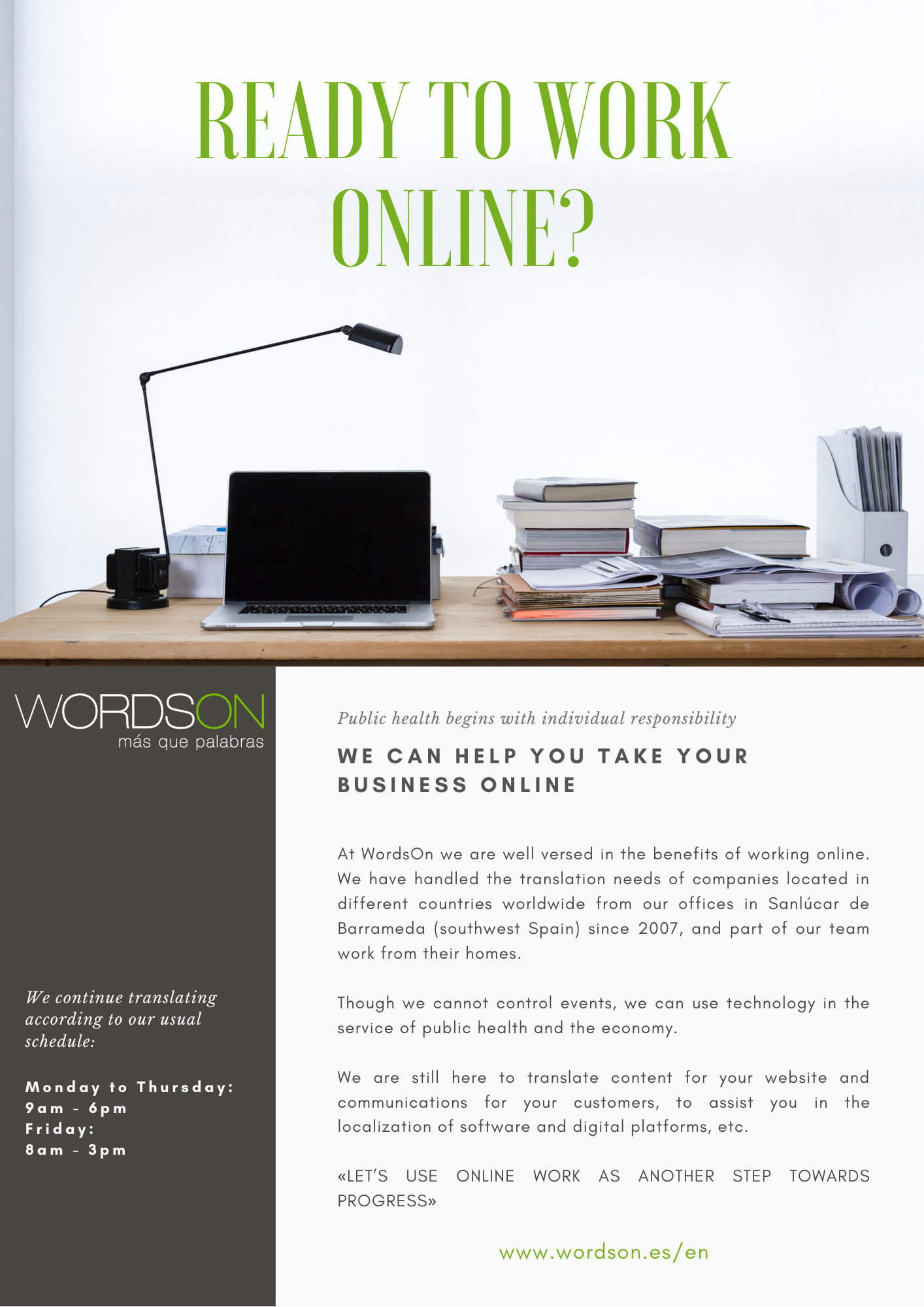 Public health begins with individual responsibility. We can help you take your business online. We are still here to translate content for your website and communications for your customers, to assist you in the localization of software and digital platforms, etc....